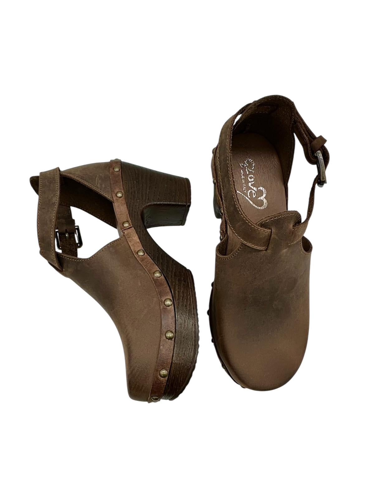 FRIDA colore MOKA è un sandalo chiuso con tomaia in vera pelle crazy. La tomaia è rifinita con bordo cucito che rende piacevole indossarla. Il soletto è in vera pelle e insieme alla pelle naturale della tomaia e al fondo anatomico in PU, rendono questa calzatura particolarmente comoda. FRIDA CRAZY MOKA è la scarpa per te!